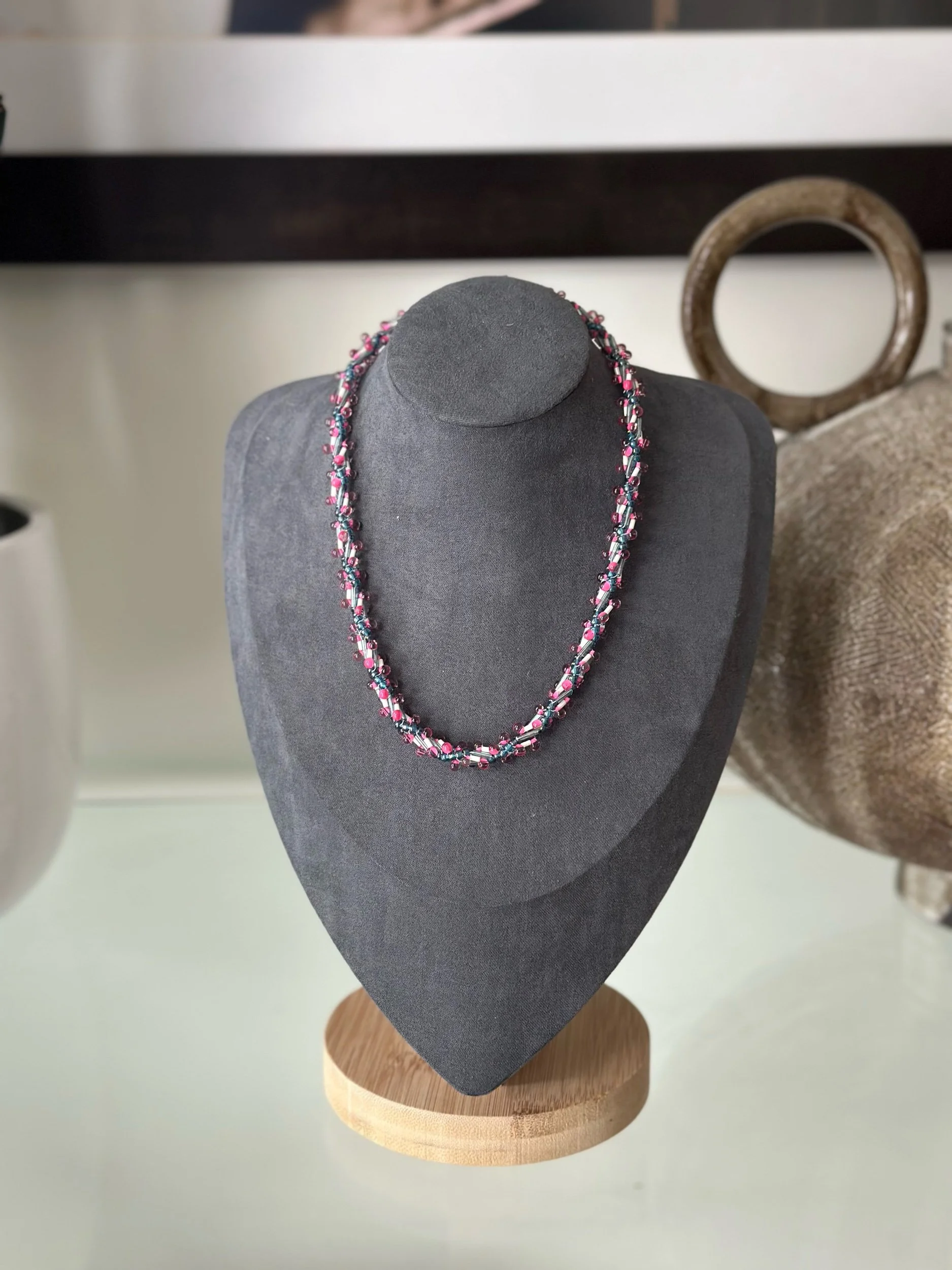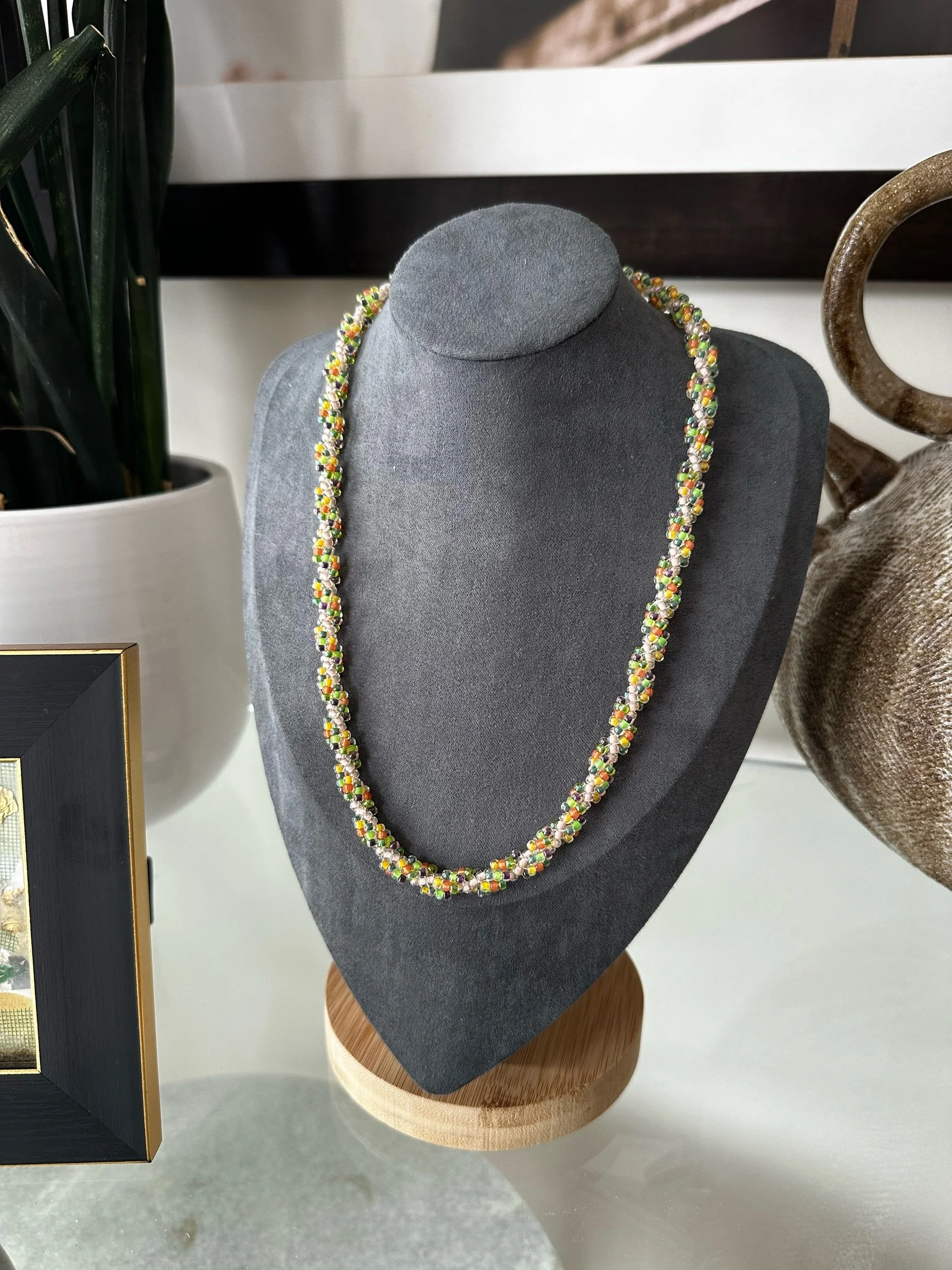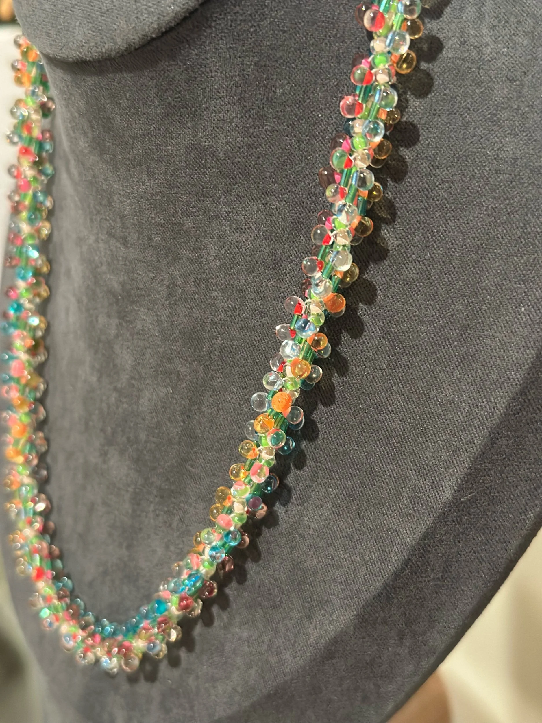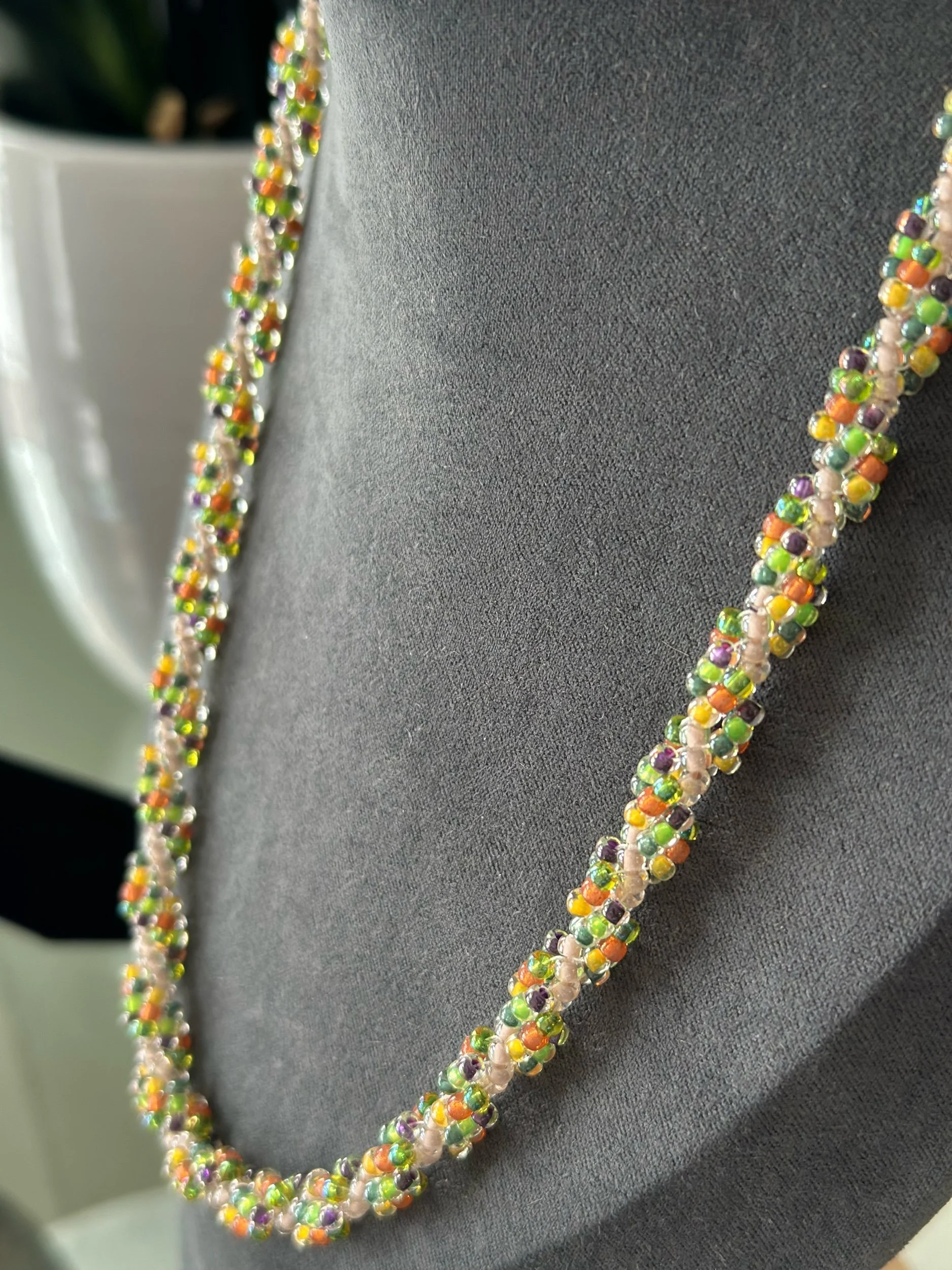 This necklace is entirely hand beaded using Japanese glass beads chosen one by one. Each bead is thoughtfully considered in relation to the next, and every stitch is placed with care, allowing the design to unfold slowly rather than be rushed.
